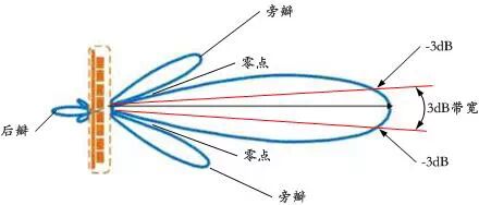 天线的方向图通常都有两个或者多个瓣,其中辐射强度最大的是主瓣,其余被称为副瓣或者旁瓣。在主瓣最大辐射方向的两侧,辐射强度降低3dB(功率密度降低一半)的两点间的夹角称为波束宽度(也称波瓣宽度或者主瓣宽度)。波束宽度越窄,方向性越好,抗干扰能力越强。示例如下: