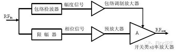 EER技术中射频输入信号的幅度和相位分开,相位信号经过非线性功率放大器。此类放大器工作在开关状态,故从理论上来讲会有100%的效率。同样,幅度信号在被放大之前可以从射频输入信号分离出来。而在信号被放大的过程中,包络信号又可以恢复到载波信号中。幅度信号和相位信号在时间的要求方面要尽量一致,因此在相位信号支路加入延时线,力求根据控制该线的长短来满足上述要求。当然EER技术本身也存在缺点。当包络恢复到载波信号时,是根据调节射频功率放大器的偏置电压来完成实现的,其实调节漏极电压来校正放大器的输出信号的幅度时,相位本身也在变化。这样就会把有用信号的频谱延伸,从而消弱了射频功率放大器的线性度。另外,包络恢复反馈环路的动态范围也比较小。