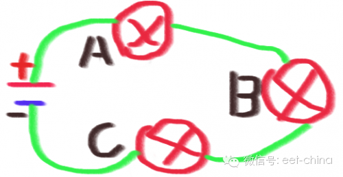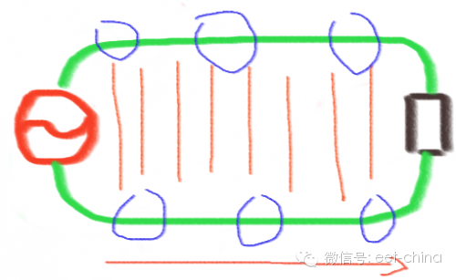 在现实中,能量的传递,都是从A到B点,而在微观世界中,能量的传递只有两种,那就是基于粒子传递,如同扔石头,或者基于波的传递,如同声音或者水波,只有这两种。但是,电路是基于一个回路的,大家日常想着电流从电源的正极留出到电源的负极,或者电子从负极流出到达正极,这个是电路理论经常提到的,深入人心,但这个明显存在一个问题,就是这个回路里面,到底那个负载先上电呢?是靠近正极的A,还是靠近负极的C?