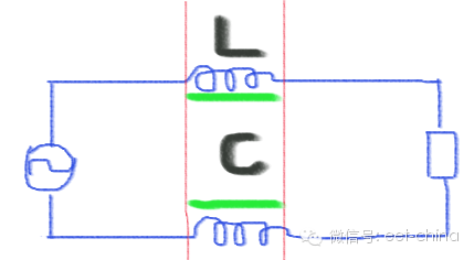 取一小段传输线来,红线中间部分,我们用集中元器件来描述,导线的长度,就是电感L,导线之间就是电容C。电感对应的是磁场,电容对应的是电场,这两个能量要相等。