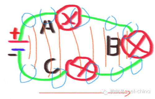 既然电路的理论基础是电磁场,能量的传递必须从信号源点到终端,不可能是回路形式,那么如下图,红色细线是电场,从信号源扩展到负载B,蓝色细圆圈是磁场,也从信号源扩展到负载B,理论上讲,电路的顺序是A、C、B,这样的顺序。