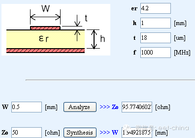 如上图右边的模型图,上面是宽度为W的信号线,PCB的覆铜一般是0.018毫米。下面是参考地,参考地要尽可能大于三倍的W宽度。信号线与地之间的高度是h,一般都是PCB的标准材料FR4,需要注意的是,不同厂家的FR4介电常数基本差不多,严格的需要厂家提供数据,并且还跟频率有关,一般1GHz以内的,取值4.2。