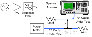 在图2中,功率放大器通过约5米长的射频电缆接到负载,功率计用于监测放大器的输出功率;连接频谱分析仪的射频电缆另一端也接上标准负载。在这个测试系统中,连接功率放大器的电缆存在射频泄漏,并会通过另一条电缆进入到频谱分析仪,功率计的读数减去频谱分析仪的读数即为二条电缆屏蔽效果之和。如果选用二条同样的电缆,即可容易的算出这种电缆的屏蔽效果。在测试中,尽可能的将频谱分析仪至于空旷环境并远离功率放大器。