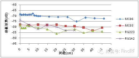 图3是几种常用的射频电缆的屏蔽效果测试结果。当选用半刚和半柔电缆时,频谱分析仪就无法读出微弱的泄漏信号了。