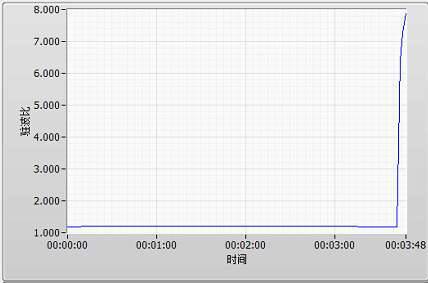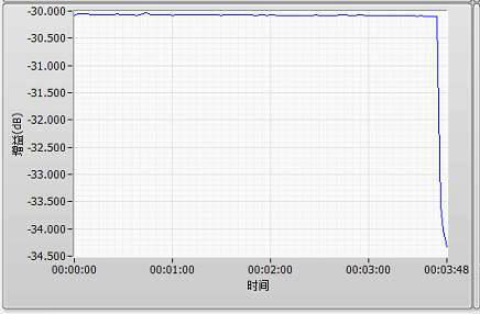 开始测试时,测试系统显示被测衰减器呈现良好的驻波比表现,同时衰减量也十分稳定,只是温度在不断上升。当测试进行到三分钟多时,出现了故障的现象——驻波比从1.15 急剧变大到8、衰减量从30.1dB 急剧变化到34.3dB!(图3)