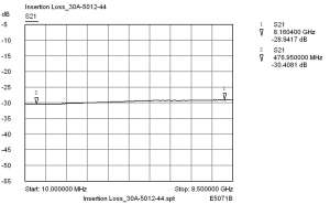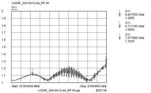 更有意思的现象还在后面,上述大功率试验后,我们用网络分析仪对衰减器重新进行测试,发现其居然是正常的!其驻波约为1.11@2GHz,衰减量约为30.1@2GHz