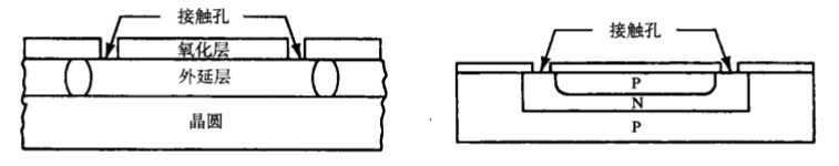 EPI电阻器:一个电阻器可以通过隔离一部分外延层区域来形成(参见下图)。在表层氧化和掩膜生成接触孔后,剩下的是具有电阻器功能的三维区域。