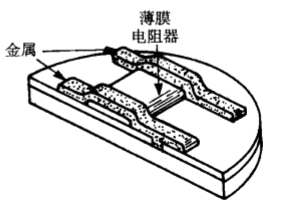 下图所示的电阻器或者按照薄膜淀积、掩膜的工艺顺序生成,或者是由剥离(lift-off)技术生成。当电阻器在芯片表面生成后,通过与其两端接触的导电金属线连接到电路中。镍合金、钛、钨等是构成电阻器的典型金属。